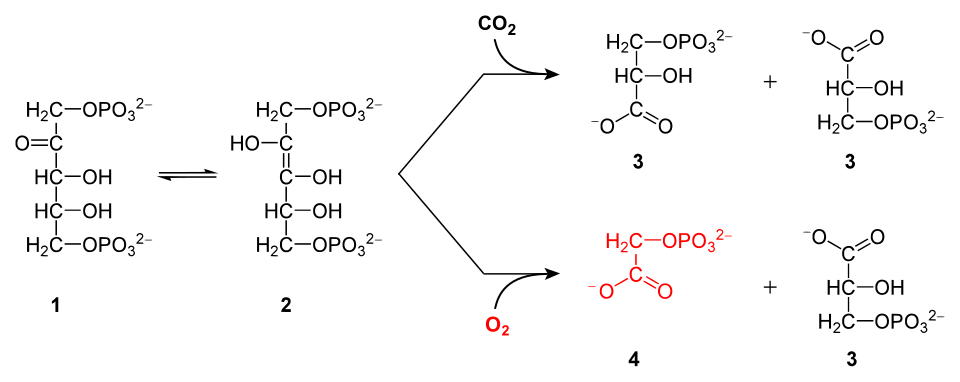 Alternativ akzeptiert RuBisCO auch Sauerstoff. Bei der Fixierung von Sauerstoff fällt stattdessen ein Molekül 2-Phosphoglycolat an (4), das in größeren Mengen giftig wirkt und daher über die Photorespiration entsorgt werden muss.