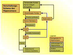 Abzweigungen derselben Axone, die Schaffer-Kollateralen, verknüpfen die Kette weiter bis in die CA1-Region, wo sie wiederum an Pyramidenzellen enden. Außerdem erreichen Axone des Cortex entorhinalis das Stratum lacunosum-moleculare der CA1-Region. Die Axone der CA1-Pyramidenzellen bilden einen weiteren Teil des Fornix, außerdem projizieren sie in das Subiculum. Diese Projektion ist der Haupteingang des Subiculums. Daneben erhält es Afferenzen aus dem Cortex perirhinalis und Cortex entorhinalis. Seinerseits projiziert es in die Großhirnrinde beider Seiten zurück, außerdem in den Nucleus accumbens, die Amygdala, den präfrontalen Cortex und den Hypothalamus.