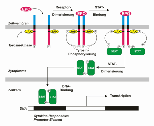 Im Allgemeinen werden extrazelluläre Signalgebungspeptide wie Wachstumsfaktoren auf Zielzellen von spezifischen Transmembran-Rezeptoren mit intrinsischer (eigener) Tyrosinkinaseaktivität gebunden. Im Unterschied dazu besitzen die meisten Zytokinrezeptoren des JAK-STAT-Weges keine intrinsische Tyrosinkinaseaktivität. Stattdessen stellen rezeptorassoziierte zytoplasmatische Proteine aus der Familie Januskinase (abgekürzt JAK, früher auch für Just Another Kinase) eine vergleichbare Aktivität bereit. JAKs sind evolutionär konserviert, wobei vier verschiedene Varianten in Säugetierzellen zu finden sind (JAK1, JAK2, JAK3 und TYK2). Die Bedeutung von JAKs, insbesondere im Immunsystem, wird durch erbliche Immunodefizienzen unterstrichen, bei denen die Rezeptor-Kinase-Assoziation oder die Kinaseaktivität durch Mutationen gestört ist. JAKs binden an spezifische Stellen der intrazellulären Rezeptordomänen und katalysieren ihre gegenseitige ligandeninduzierte Tyrosinphosphorylierung, was ihre Kinaseaktivität erhöht. Anschließend kommt es zur Phosphorylierung von Tyrosinen des Rezeptors.