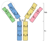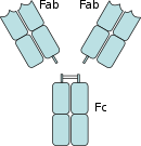 Die beiden Leichtketten sind je nach Organismus und Immunglobulin-Subklasse entweder vom Typ κ oder λ und bilden zusammen mit dem oberhalb der Gelenkregion (engl. hinge region, auch: Scharnierregion) liegenden Anteil der Schwerketten das antigenbindende Fragment Fab (engl. antigen-binding fragment), welches enzymatisch mit Hilfe von Papain von dem darunterliegenden kristallisierbaren Fragment Fc (engl. crystallisable fragment) abgespaltet werden kann. Die außergewöhnliche Variabilität der Antigenbindungsstellen (engl. Complementarity Determining Region, CDR) erreicht der Organismus vermittels der V(D)J-Rekombination.