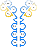 Da einige Aminosäurereste Zuckerketten tragen, zählen Antikörper zu den Glykoproteinen. Jeder Antikörper besteht aus zwei identischen schweren Ketten (engl. heavy chains, H) und zwei identischen leichten Ketten (engl. light chains, L), die durch kovalente Disulfidbrücken zwischen den Ketten (sogenannte Zwischenketten-Disulfide) zu einer Ypsilon-förmigen Struktur miteinander verknüpft sind. Die leichten Ketten (auch: Leichtketten) bestehen aus jeweils einer variablen und einer konstanten Domäne. Bezeichnet werden diese als VL und CL. Die schweren Ketten (auch: Schwerketten) hingegen haben jeweils eine variable und drei (IgG, IgA) bzw. vier (IgM, IgE) konstante Domänen. Bezeichnet werden diese analog als VH und CH1, CH2, CH3.