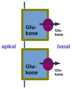 Die Aufgabe von GLUT-2 in der Dünndarmschleimhaut ist es normalerweise, die über SGLT1 und GLUT-5 aus dem Darmlumen aufgenommenen Glucose-, Galactose- und Fructosemoleküle ins Blut zu schleusen. Jedoch wird GLUT-2 bei hohem Glucoseanteil der Nahrung auch apical (ins Darmlumen) lokalisiert und erhöht so die Glucoseaufnahme durch Diffusion. Ähnlich zu SGLT1 resorbiert GLUT-2 in den Nieren Glucose zurück.[4][5]
