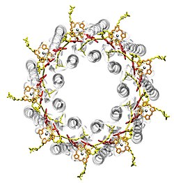 Bei Purpurbakterien sind die Lichtsammelkomplexe in der Plasmamembran eingebaut. Es handelt sich wie bei pflanzlichen Lichtsammelkomplexen um Transmembranproteine. Die meisten Spezies besitzen zwei Arten von Lichtsammelkomplexen, die LH1 und LH2 genannt werden. Einige Spezies besitzen zusätzlich einen LH3, andere ausschließlich LH1. Alle Komplexe haben eine ringförmige Struktur, die aus identischen Untereinheiten besteht. Die Abbildung zeigt beispielsweise den LH2-Komplex von Rhodopseudomonas acidophila, der aus neun Untereinheiten besteht. Jede Untereinheit besteht aus zwei dicht beieinander liegenden Bakteriochlorophyllen (rot) und einem dazu um 90° gekippten weiten Bakteriochlorophyll (orange, nicht in LH1) sowie einem Carotinoid (gelb). Die Pigmente werden nicht-kovalent von zwei kurzen Proteinen (grau-transparent) gebunden. LH1 ist sehr ähnlich aufgebaut, besteht aber aus mehr Einheiten, z. B. 16. Dadurch ergibt sich ein größerer Ring, in dessen Mitte sich das Reaktionszentrum befindet.