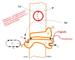Glykoside der Digitalis-Gruppe (Digoxin, Digitoxin und dessen Aglykon Digitoxigenin) und der Gruppe der Strophanthusgewächse (g-Strophanthin (engl. Synonym: Ouabain) und k-Strophanthin) – letztere jedoch nur in hohen Konzentrationen – blockieren die K+-Konformation der ATPase noch im phosphorylierten Zustand. Damit hemmen sie den Ionentransport.