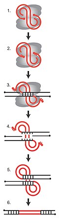 - Die Integrase schneidet die Wirts-DNA an einer zufälligen Stelle, so dass 5'-Überhänge von 4–6 Nukleotiden entstehen, und verbindet die verkürzten 3'-Enden der viralen DNA mit der Wirts-DNA.