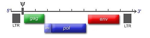 Das einzelsträngige RNA-Genom der Retroviren ist linear und 7–12 Kilobasenpaare (kb) groß. Retroviren sind die einzigen RNA-Viren, die diploid angelegt sind, d. h. jedes Retrovirus hat eine zusätzliche Kopie seines Genoms. Sie werden von den wirtseigenen Transkriptions-Enzymen übersetzt und synthetisiert und benötigen eine spezifische zelluläre tRNA. Das provirale Genom eines einfachen Retrovirus enthält in der Regel drei Gene und zwei Long Terminal Repeats (LTRs), die sich am Anfang und am Ende befinden und Informationen zur Steuerung der Expression der viralen Gene enthalten. Bei den drei Genen handelt es sich um gag (Gruppenspezifisches Antigen), pol (Polymerase) und env (envelope). gag codiert die Matrix-, Kapsid- und Nukleokapsidproteine. pol codiert die viralen Enzyme Protease, Reverse Transkriptase (mit RNase H) und Integrase. Bei den Beta- und Deltaretroviren hat die Protease ein eigenes Leseraster (pro) und bei den Alpharetroviren befindet sich die Information für die Protease im gag-Gen. env codiert die Proteine der Hülle. An regulatorischen Sequenzen gibt es im 5'-Bereich eine mit ψ (psi) bezeichnete Sequenz, die ein Signal für das Verpacken der RNA in die Viruspartikel ist, eine Primerbindungsstelle (PBS), an die sich die jeweilige tRNA anlagern kann und einen Promotor. Im 3'-Bereich finden sich ein oder mehr Polypurintrakte, die bei der reversen Transkription essentiell sind.