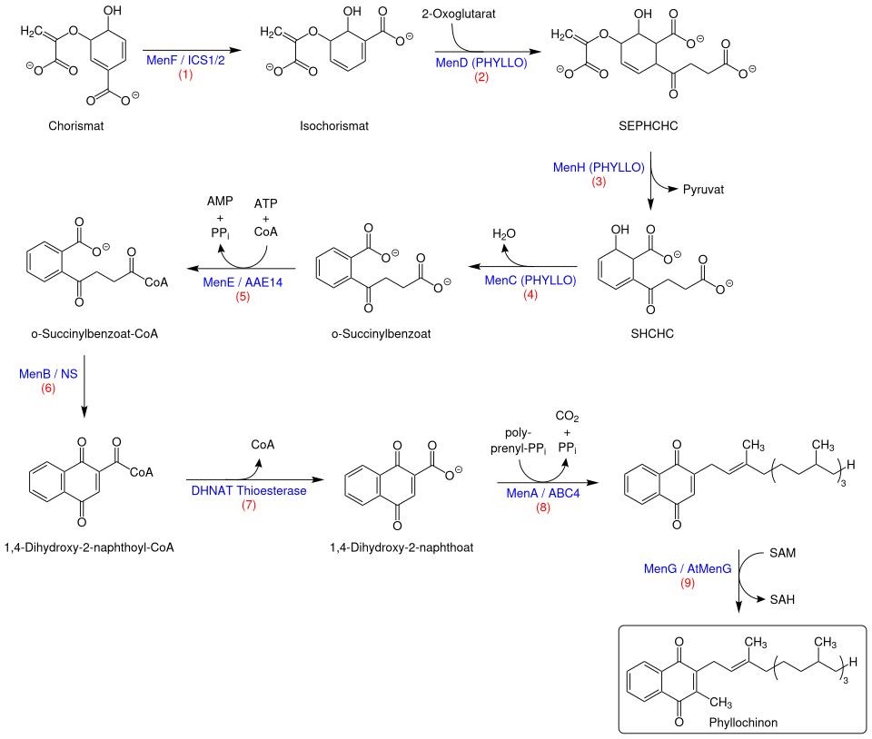 - In Pflanzen entsteht das aromatische Grundgerüst im Zuge des Shikimisäureweges aus Chorismat, die Reaktionen finden in den Plastiden und Peroxisomen statt und münden in der Bildung von 1,4-Dihydroxy-2-naphthoat. Insgesamt ähnelt die Biosynthese Phyllochinons der von Menachinon (Vitamin K2) in E. coli.