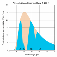 Da wegen des kirchhoffschen Strahlungsgesetzes ein Strahler bei denjenigen Wellenlängen, bei denen er gut emittiert, auch gut absorbiert, stellt die Abbildung gleichzeitig das Absorptionsspektrum von Luft gegenüber thermischer Strahlung dar.
