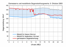Die rote Kurve im nebenstehenden Diagramm zeigt den auf diese Weise von einer Wetterstation bei München gemessenen Verlauf der Gegenstrahlung am 6. Oktober 2005. Während des Vormittags herrschte Hochnebel. Die Nebeltröpfchen trugen als effiziente langwellige Strahler zu relativ hohen Strahlungswerten von ca. 370 W/m² bei. Gegen Mittag löste sich der Nebel auf und ließ einen klaren Himmel zurück. Die Atmosphärengase alleine sind weniger effiziente langwellige Strahler, die Strahlungswerte gingen daher merklich zurück, auf etwa 300 W/m². Die graue und die blaue Kurve wurden zum Vergleich für bedeckten bzw. klaren Himmel mittels empirischer Strahlungsmodelle (siehe unten) aus den gleichzeitig gemessenen Temperaturen und Luftfeuchten berechnet.