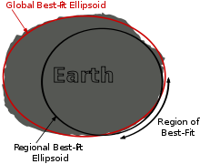 Während ein Referenzellipsoid wie oben dem regionalen Geoid angepasst wird, nähert sich das mittlere Erdellipsoid hingegen global am besten dem Geoid an, Dennoch bleiben radiale Unterschiede zwischen +75 m (Kanada) und -120 m (Indik) bestehen. Das Erdellipsoid war um 1960 nur auf etwa 100 Meter genau bekannt, wird aber seither schrittweise verfeinert und etwa alle 20 Jahre dem aktuellen Wissensstand angepasst.