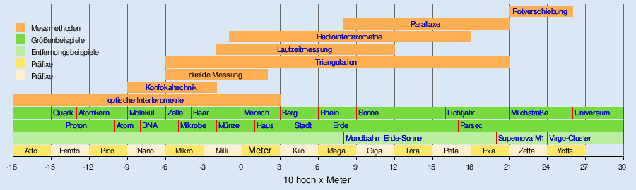 Das folgende Schaubild gibt einen Überblick über die Einheitenvorsätze bei Längen- und Entfernungsmessungen, enthält Beispiele für die Größenbereiche und ordnet die jeweiligen Messprinzipien zu.