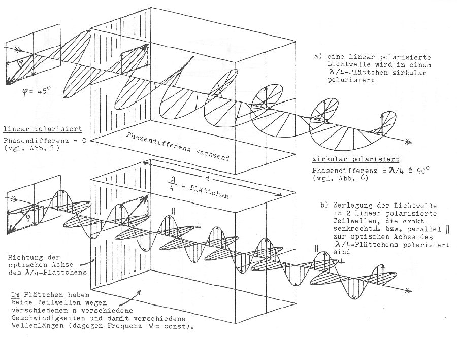 Eine Lichtwelle, die vor dem Plättchen linear polarisiert ist, wandert hindurch und ist dahinter zirkular polarisiert. Die Abbildung zeigt dieselbe Welle in zwei Darstellungen: oben als resultierende Welle, zunächst linear, dann zirkular polarisiert; unten dieselbe Welle zerlegt in zwei linear polarisierte Anteile parallel bzw. senkrecht zur ausgezeichneten Richtung des Plättchens. An dieser unteren Darstellung erkennt man, wie die beiden Komponenten innerhalb des Plättchens verschieden schnell laufen, so dass sie eine immer größere Phasenverschiebung erfahren, die hinter dem Plättchen dann auf Lambda/4 angewachsen ist, so dass die Überlagerung der Teilwellen zur zirkular polarisierten Welle führt.