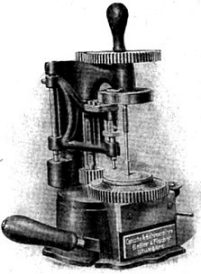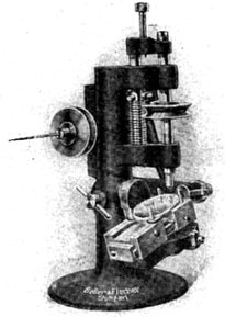 Diese abgebildete, eigens für Optiker konstruierte, Bohrmaschine wurde ebenfalls mit Kraftstrom angetrieben. Der kippbare Tisch gestattete, daß das Loch geometrisch richtig zur Glasmitte gebohrt werden konnte, damit das Glas anschließend genau in die Klammer paßte, ohne das die Schraube einen einseitigen Druck ausübte.Das Glas wurde durch vier Stifte fixiert - eine Mikrometerschraube ermöglichte die Bohrung in beliebigem Abstand vom Glasrand.
