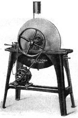 Der abgebildete Schleifstein verfügt bereits über Kraftstromantrieb. Oben im Bild ist eine Tropfvorrchtung ersichtlich, die ein Trockenlaufen des Steins verhinderte. Die Körnung des Steines war je nach Arbeitsvorgang unterschiedlich. Gröbere ("schwedische") Sandsteine wurden für das Vorschleifen eingesetzt - feinere ("schottische") Sandsteine verhalfen zu einem glatten Schliff. Um 1920 verdrängten Kunststeine immer mehr die bis dato gebräuchlichen Sandsteine. Der "Amerikanische Kunststein" vereinte außerordentliche Härte mit feinster Körnung. Dies bedeutete eine noch nie dagewesene Zeitersparnis beim Schleifen von Brillengläsern. Die Verwendung des Schleifsteins war nicht so einfach, da durch den Motor eine relativ starke Vibration erzeugt wurde. Der Schleifstein war aus diesem Grund mit dem Boden verankert. Die Pflege des Schleifsteins war zumeist dem jüngsten Lehrling unterstellt.