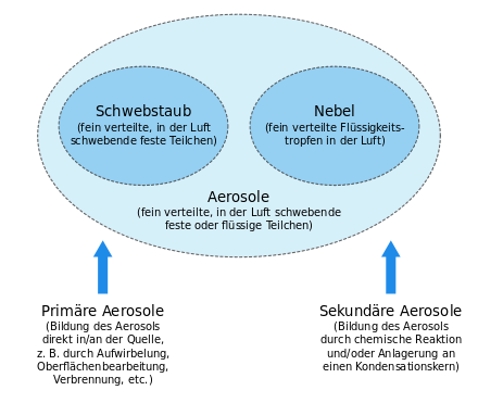 In Abhängigkeit von dem Ursprung der Teilchen lässt sich zwischen primären und sekundären Aerosolen unterscheiden. Die Teilchen der primären Aerosole stammen meistens aus mechanischen oder thermischen Prozessen. Bei den sekundären Aerosolen haben sich die Teilchen aus gasförmigen Stoffen durch chemische Reaktion und/oder durch Anlagerung der Reaktionsprodukte an Kondensationskerne gebildet.