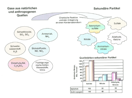 - natürliche anorganische Anteile: durch Erosion entstandener Wüsten- bzw. Mineralstaub, vulkanische Asche und Schwefeldioxid sowie Meersalz