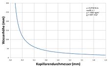Abhängigkeit der Flüssigkeitshöhe in einer Kapillare vom Durchmesser der Kapillare (Wasser/Glas).