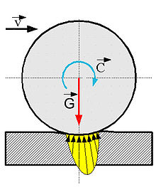 - Kombination Stahlrad-Schiene bei der Eisenbahn. In nebenstehenden Bild wird durch das Rad die Schienenoberfläche elastisch verformt, bei Bewegung wird das Schienenmaterial in Fahrtrichtung gestaucht. Dabei türmt sich vor dem Rad ein Berg auf. Da sich das Schienenmaterial nur geringförmig bewegt, wird fortlaufend der Berg durch das Rad gewalzt und ebnet sich hinter dem Rad wieder ein. Beim Durchrutschen wird infolge des großen Flächendrucks das Material stark gepresst. Je häufiger eine Schiene befahren wird, desto eher können infolge der Pressung und Entspannung Teile der Oberfläche ausbrechen, was durch matte oder raue Oberflächen erkennbar wird. Ein Nebeneffekt ist die in einem nachgiebigen Schotterbett liegende Schienen-Schwellen Kombination, die dämpfend wirkt. Da sich das Rad während der Fahrt in dem „Tal“ der Eindruckstelle befindet, muss dieses auch bei horizontaler Strecke ständig neu gebildet werden. Es wandert während der Fahrt mit, was einen entsprechenden Energieverlust bedeutet. Der Effekt ist jedoch kleiner als der oben genannte. Hinzu kommt Reibung bei Kurvenfahrt aufgrund der starren Achsen.