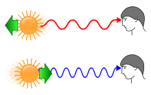 Bewegt sich die Strahlungsquelle vom Beobachter weg, so wird die Spektrallinie zu größeren, roten Wellenlängen hin verschoben. Die Welle wird gewissermaßen auseinandergezogen. Dies nennt man Rotverschiebung. Bewegt sich die Strahlungsquelle auf den Beobachter zu, so wird die Spektrallinie zu kleineren Wellenlängen hin verschoben. Dies ist gerade die Blauverschiebung, weil die Linie zum blauen Teil des Spektrums verschoben wird. Anschaulich kann man sich vorstellen, wie die elektromagnetische Welle gestaucht wird.