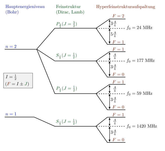 Fein- und Hyperfeinstruktur des Wasserstoffatoms mit den resultierenden Strahlungsfrequenzen.