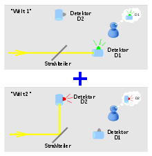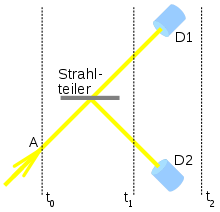 - „Ein Photon befindet sich zur Zeit t₀ in der Region A und bewegt sich auf den Strahlteiler zu. Zur Zeit t₁, nach Passieren des Strahlteilers, sind für das Photon zwei unterschiedliche Routen möglich: Entweder bewegt es sich auf den Detektor D1 zu, oder auf den Detektor D2.“