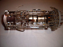 Im nebenstehenden Bild ist das Strahlsystem einer veralteten Fernsehbildröhre mit Ionenfalle zu sehen. Die bis zur Rotglut geheizte Kathode ist nicht zu sehen. Ganz rechts sind der Wehneltzylinder sowie die Vorbeschleunigungselektrode zu erkennen. Danach folgt links die Anode, in deren Verlauf das Strahlsystem axial zum Röhrenhals abknickt. Der Grund für diese heute nicht mehr erforderliche Konstruktion ist die Separierung der ebenfalls beschleunigten Restgas-Ionen vom eigentlichen Elektronenstrahl, die ansonsten einen Ionenfleck hervorriefen.