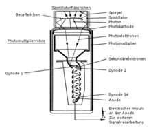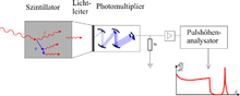 Im Messgerät werden die im Szintillator pro Zerfallsakt entstehenden Lichtblitze in einem Photomultiplier (siehe Abb. 3) in elektrische Impulse umgewandelt. Da die Verstärkung in dem Photomultiplier proportional ist, das heißt, alle Impulse werden um den gleichen Faktor größer, ist die Höhe des elektrischen Impulses am Ausgang proportional zur Energie des beobachteten Teilchens.