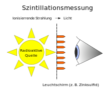 Die Szintillationsmessung ist eine der ältesten Messmethoden zum Nachweis von ionisierender oder Röntgen-Strahlung. Ursprünglich wurde ein Zinksulfidschirm in den Strahlengang gehalten und die Szintillationsereignisse entweder als Blitze gezählt oder im Fall der Röntgendiagnostik als Bild betrachtet (Abb. 1). Ein als Spinthariskop bezeichneter Szintillationszähler wurde von Rutherford zur Untersuchung der Streuung von α-Teilchen an Atomkernen eingesetzt.