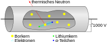 gleichzeitig entstehenden Ionen, das Alphateilchen und der Lithium-Atomkern,