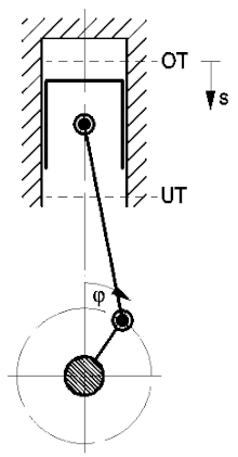 - Der Kurbelwinkel wird zwischen der Zylinderlängsachse und dem Hubzapfen der Kurbelwelle gemessen und in Richtung der Kurbelwellendrehung gezählt. Beim Ottomotor wird der Zündzeitpunkt (Zündwinkel) auf den Kurbelwinkel bezogen, negative Winkel werden häufig als „φ Grad vor OT“ angegeben. Die Zählung wird beim Viertakt-Motor gelegentlich über alle Arbeitstakte fortgesetzt, so dass der Kurbelwinkel zwischen 0 und 720° liegen kann.
