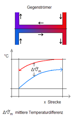 und beim Gegenstrom sind dies die Temperaturdifferenzen jeweils zwischen Eintritt des einen Mediums und Austritt des anderen Mediums.[5]