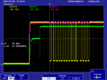 - Mehrkanaloszilloskop im Chopper-Betrieb: Es wird schnell zwischen den Eingängen umgeschaltet, und die Teilstücke der Verläufe werden auf dem Bildschirm dargestellt, zur besseren optischen Trennung auf verschiedenen Höhen. Die Darstellung besteht für jeden Kanal aus einer gestrichelten (zerhackten) Linie, deren Segmente aber bei hoher Umschaltfrequenz (im Verhältnis zur Ablenkfrequenz) so nahe zusammenrücken, dass das Auge einen geschlossenen Kurvenzug sieht. Wenn ein Signal triggert, laufen die anderen zeitgleich mit. Diese Betriebsart wird meist bei geringen Ablenkfrequenzen benutzt, zum Beispiel bei der Darstellung langsamer Signalverläufe unter 100 Hz.