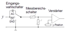 Die Eingangsspannungen werden meistens über BNC-Buchsen auf der Frontseite direkt oder unter Verwendung eines Tastkopfes angeschlossen. Die Buchsen sind bei Laborgeräten über Schutzleiter einseitig mit Masse (Gehäuse, Schutzkontakt) verbunden. Entsprechend muss jede zu messende Spannung einseitig in gleicher Weise geerdet oder potentialfrei sein. Vorzugsweise sind 2 oder 4 Eingangskanäle vorhanden für die Beeinflussung der y-Ablenkung von 2 oder 4 Eingangsspannungen.