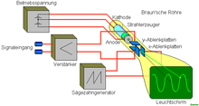 Bei analogen Oszilloskopen wird die zu messende Spannung über einen umschaltbaren Verstärker auf den Bildschirm einer Kathodenstrahlröhre mittels eines Elektronenstrahls „projiziert“. Genauer gesagt wird der auf einen Punkt fokussierte Elektronenstrahl durch die Eingangsspannung in y-Richtung abgelenkt. Bei zeitabhängiger Darstellung muss zeitgleich für die x-Ablenkung eine Kippschwingung erzeugt werden, welche, durch die Triggerung ausgelöst, gleichmäßig mit umschaltbarer Steilheit ansteigt und dann schnell wieder abfällt. Die Anstiegsdauer dieser sägezahnförmigen Kippschwingung ergibt die Dauer des angezeigten Signalabschnitts. Sie ist zumeist in einem sehr weiten Bereich einstellbar. Der Elektronenstrahl bewegt sich dadurch von links nach rechts (während dieser Zeit entsteht das Bild, das nach kurzer Nachleuchtdauer wieder verschwindet) und kehrt anschließend sofort zum Ausgangspunkt zurück. Dabei wird der Strahl dunkel getastet, damit der Rücklauf des Leuchtflecks nicht zu sehen ist.