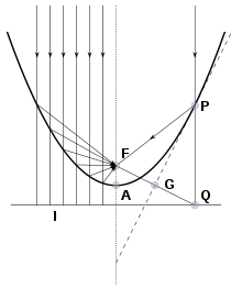 Die Mittelsenkrechte PG des Dreiecks PQF ist die Tangente an die Parabel im Punkt P. Sie bildet mit dem Strahl PF und dem senkrecht einfallenden Strahl den gleichen Winkel, spiegelt letzteren also in Richtung zu F, dem Brennpunkt.