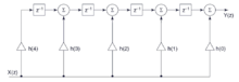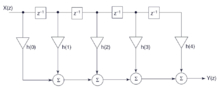 Die dabei auftretenden Faktoren h(i) stellen die Filterkoeffizienten dar. Durch Umformen lässt sich die Übertragungsfunktion ermitteln: