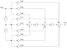 FIR-Filter höherer Ordnungen lassen sich auch in mehrere kleinere FIR-Filter niedrigerer Ordnung, meist 2. Ordnung, aufspalten und seriell aneinanderschalten (kaskadieren), um als Summe die Übertragungsfunktion des Filters höherer Ordnung zu bilden. In nebenstehender Abbildung ist ein kaskadiertes FIR-Filter 6. Ordnung dargestellt, bestehend aus drei einzelnen FIR-Filtern jeweils 2. Ordnung. In der meist englischsprachigen Fachliteratur werden diese Filterstrukturen auch als Second Order Structure, oder abgekürzt als SOS-Filter, bezeichnet.