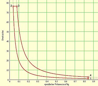 - 4➝1: isochore Druckminderung durch Wärmeabfuhr (praktisch bei Motoren mit innerer Verbrennung durch Ladungswechsel, also Ausstoßen des Abgases und Ansaugen einer frischen Gasladung)