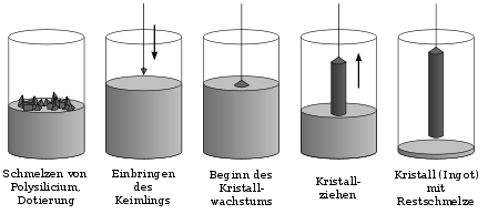 Ein an einem langsam rotierenden Metallstab befestigter Impfkristall wird von oben mit der Spitze in die Schmelze eingetaucht. Der Impfkristall muss am Metallstab exakt mit der gewünschten Kristallorientierung ausgerichtet sein, da er die Kristallorientierung des entstehenden Einkristalls vorgibt. Das um nur wenige Millimeter eingetauchte Ende des Impfkristalls muss schmelzen, bis sich eine ganz homogene Grenzschicht zwischen der Schmelze und dem festen Teil des Impfkristalls ergibt. Der Stab mit dem Einkristall wird langsam wieder nach oben gezogen, während die Schmelze an der sich ausbildenden Grenzfläche erstarrt. Durch Variation von Ziehgeschwindigkeit und Temperatur erreicht der wachsende Kristall den gewünschten Durchmesser. Mittels einer geeigneten Regelung kann der Kristalldurchmesser bis zum Ende des Ziehvorgangs sehr genau beibehalten werden.