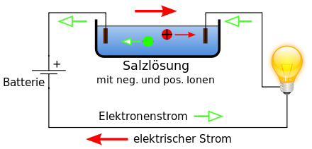 Mit roten Pfeilen ist die Richtung des elektrischen Stroms (= „technische Stromrichtung“) eingetragen. Grüne Pfeile markieren die Strömungsrichtung der negativ geladenen Ladungsträger, im Metalldraht sind dies Elektronen.